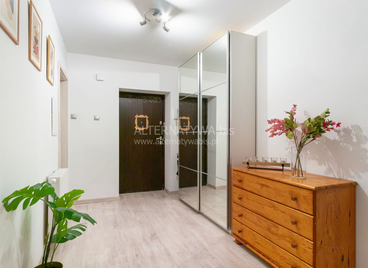 W mieszkaniu jest w pełni zabudowana i wyposażona kuchnia - płyta gazowa, piekarnik, lodówka, zmywarka. Łazienka w płytkach z wanną i pralką. W przedpokoju duża szafa PAX z lustrem. W salonie szafa PAX, narożnik. W sypialni znajduje się biurko, kosmetyczka, łóżko, szafa PAX - 2 metry. Okna PCV z wystawą wschód-zachód. Ogrzewanie gazowe (Piec gazowy 2 funkcyjny).