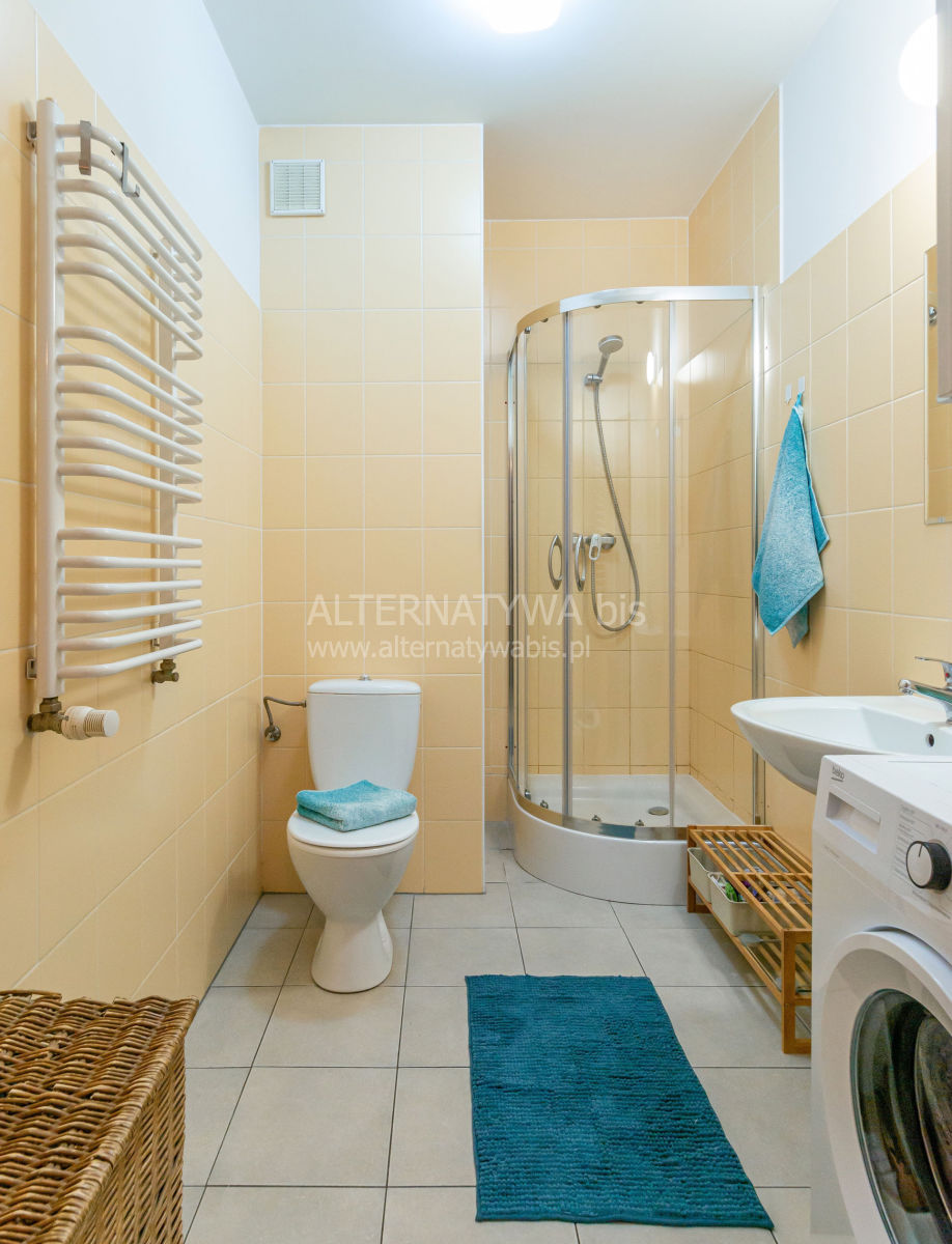 Na podłodze w pokoju są panele. W kuchni oraz w łazience są płytki. Łazienka w płytkach z prysznicem, umywalką oraz pralką. Kuchnia umeblowana wyposażona w szafki kuchenne, kuchenkę elektryczną z piekarnikiem oraz lodówkę. W korytarzu znajduję się duża zabudowana szafa oraz szafka na buty. Okna PCV.
